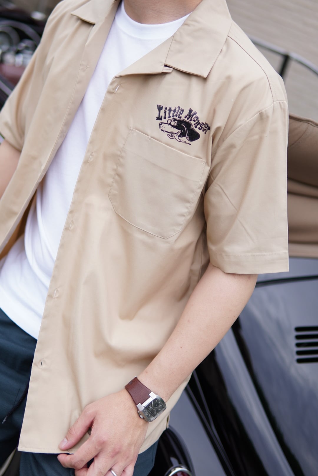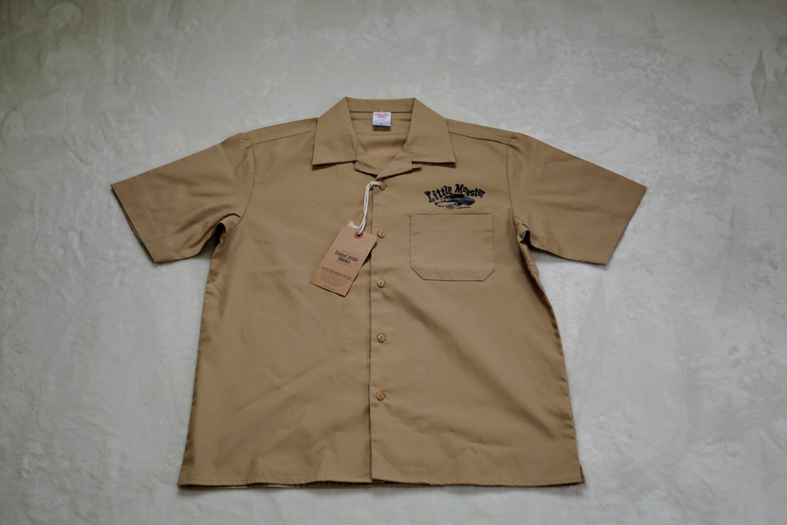 ピンストライクで描かれた犬のイラストが左胸にプリントされたかっこいいワークシャツ